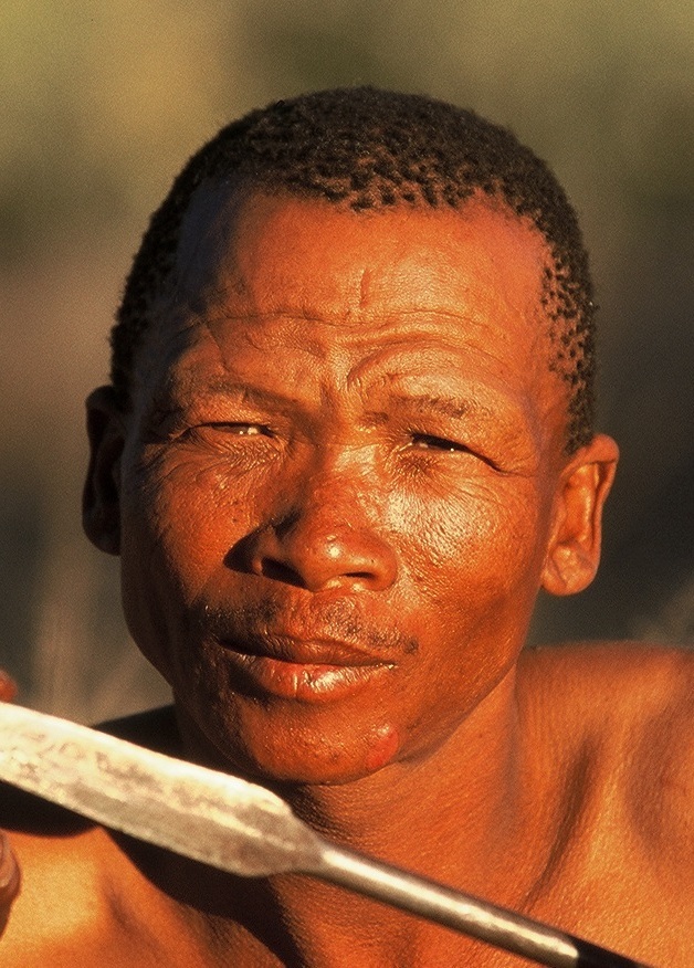 We had been hunting for two weeks with no luck. It was at the end of the dry season and the dry grass made it difficult to stalk close enough to animals to get a good shot with a bow and arrow. That morning we were tracking a healthy kudu bull. By midday we caught up with it, but again it ran away. This was when !Nate (photo), Kayate and Boroh//xao decided to run it down. It was an extremely hot day and conditions were ideal for persistence hunting. !Nam!kabe, who was too old to run far, went back to our camp with all our unnecessary weight – bows and arrows, digging sticks, clubs and my camera equipment. They told me to go back with !Nam!kabe, because no white man can run down a kudu in such heat. But I insisted that I had to run with them so that I can see how they do it.